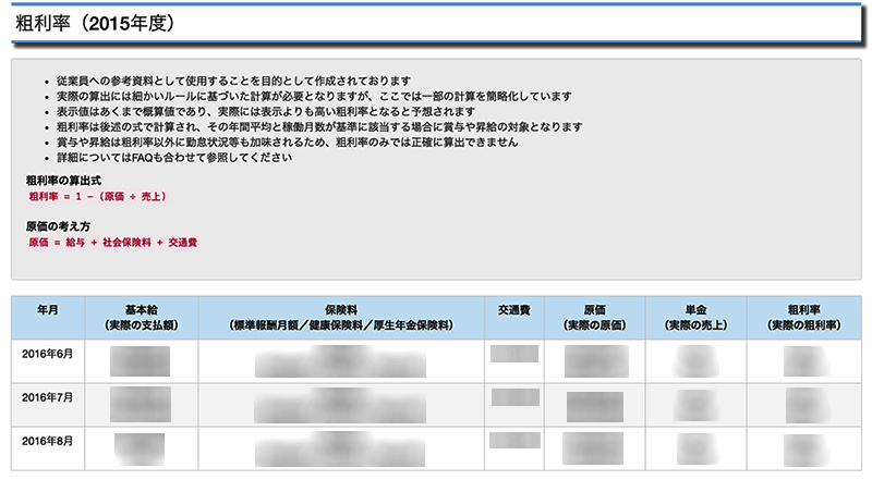 すでにリリースされていまして、下記のような感じで見ることができます。昇給や賞与の基準となるこの粗利率。みんな気になる所ですが……コレを見ればオールオーケー!1)もっとも、計算を簡略化している部分もあるので、多少の誤差はありますよ〜