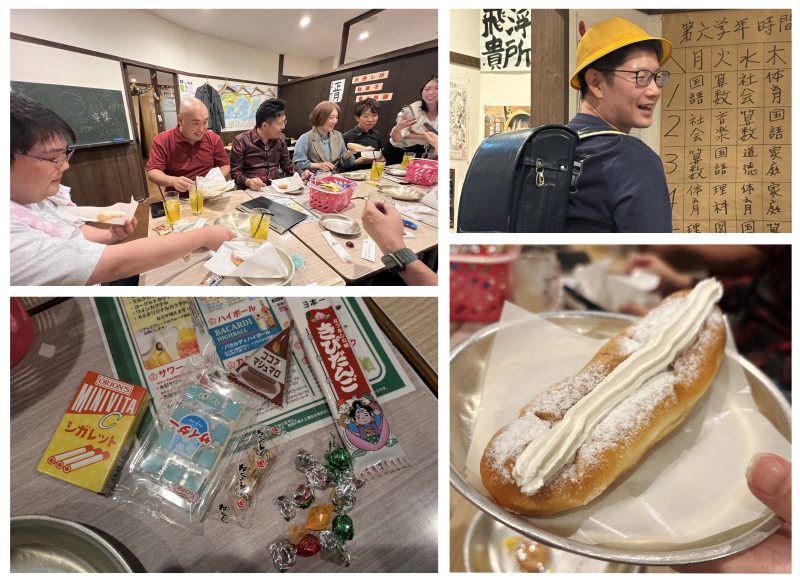 駄菓子食べ放題なので昔食べたおやつの話や教科書を見ながら習った教科の話をしていました。