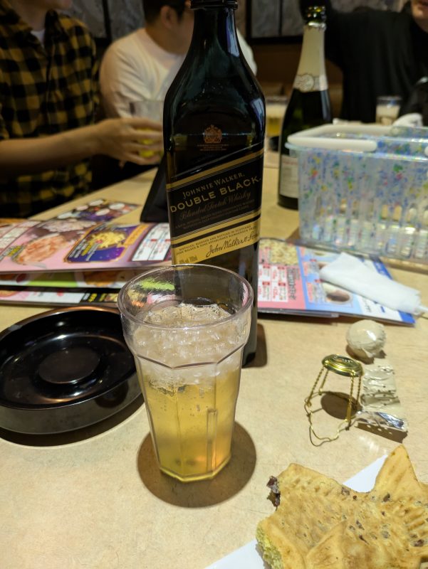 なお、いつもはみんな散々飲んだ後なので余る事も考えてコンビニで一番安いウイスキーを買っていくんですが、今回は奮発して『ジョニーウォーカー ダブルブラック』を購入。