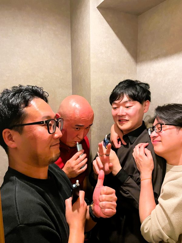 ▼喫煙所は一人か二人用のスペースでしたが、なぜか皆さんで駆け込み参加。
