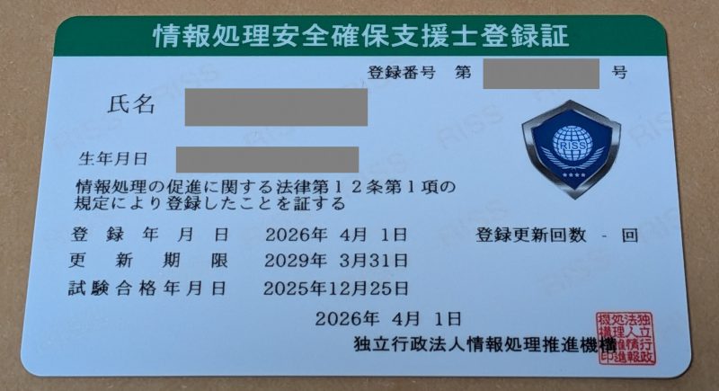 この度、情報処理安全確保支援士(登録セキスぺ)に登録しました。